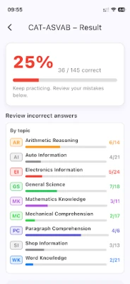 • Topic-Based Training - Focus on specific areas: General Science, Arithmetic Reasoning, Word Knowledge, Paragraph Comprehension, Mathematics Knowledge, Electronics Information, Auto Information, Shop Information, Mechanical Comprehension
