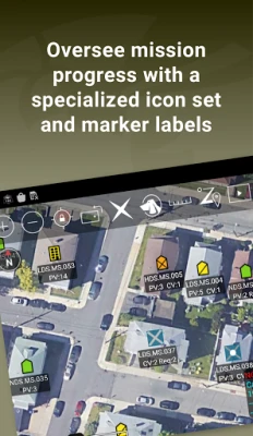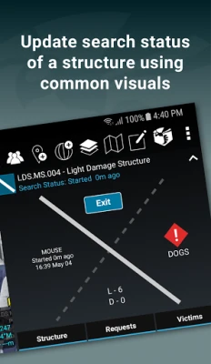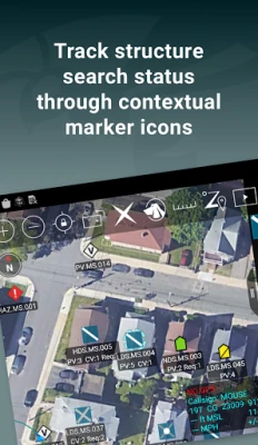 Structures can be tracked across recon, primary, and secondary search phases, using graphics based on the FEMA Search Assessment Marking. Structures of different damage levels can be marked and shared with two taps, while additional details like number of floors, construction material, and best entry location can be entered as needed.