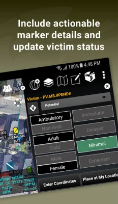 For victim markers, triage information can be entered, and locations can be updated as victims take shelter or are evacuated elsewhere.
