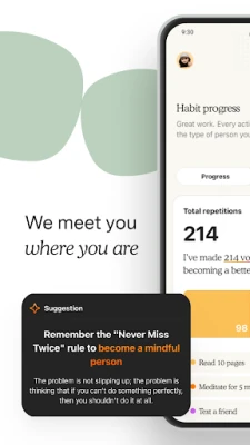 * Guided Habit Creation: Start small and build habits based on the kind of person you want to become. Get guidance on how to start at the right size for you. Create consistency by committing to a time and place. Build habits that last.