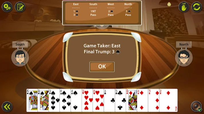 The dealer opens the first trump selection and must declare to win at least the odd trick in a trump suit or at No-trumps. It goes higher if it contracts for a higher number of points (ignoring doubles) rather than a higher number of tricks. As an example, 3 Spades (27 points) beats 4 Clubs (24 points).