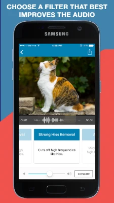 Choose from several noise reduction filters to get rid of hiss, wind and other noise to instantly clean your audio. Press and hold 'compare' to hear the difference from your original. Press and hold on a filter to bypass so you only hear the volume change.