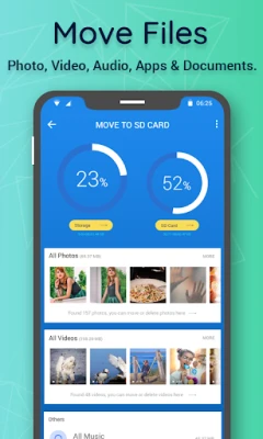 Get the all new and the most advanced Move To SD Card App which allows you to Move Files To SD Card as well as Move App To SD Card. Move your Photos, Videos, Musics, Zip Files, and all Other Downloads from your Phone Memory to SD card. You no longer have to worry about low Internal Memory.