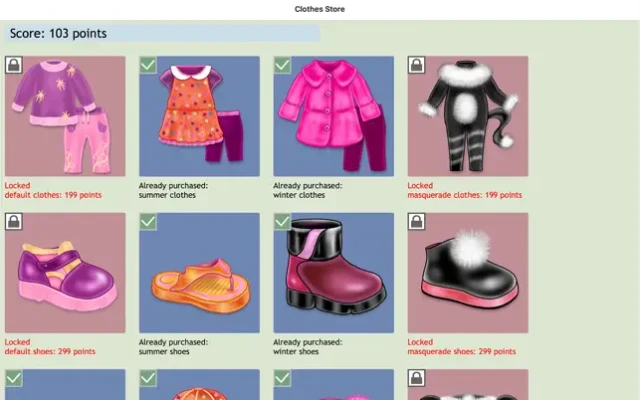 - Spend points on clothes, toys, and decorations for the Baby Room, Bathroom, Playcenter, Summer, and Winter locations.