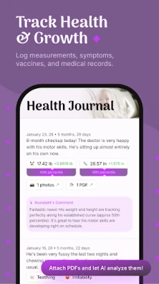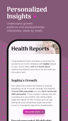 Get tailored insights into your child's development based on the data you track. Our AI provides personalized reports explaining what you should expect at the current week of gestation or age.