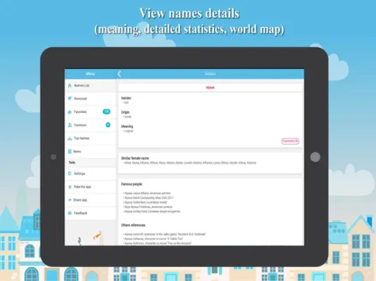 Find useful information like name meanings, statistics per country, popularity, average age, and celebrities with that name.