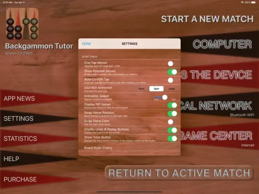 - Statistics screen: tracks games won, matches points won, as well as dice roll statistics.