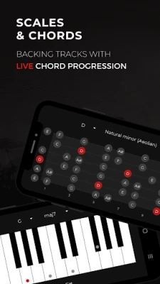 - Live Notes Mode: see the chord progression of the backing track along any scale on the guitar fretboard or piano view.