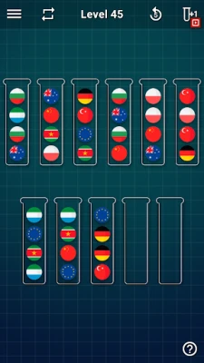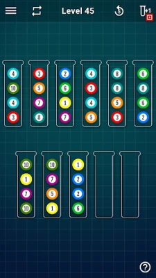 HOW TO PLAY: • Tap any tube to move the ball lying on top of any tube into another tube • The rule is that you can only move a ball on top of another ball if both of them have the same color and the tube you want to move into has enough space. Otherwise the ball is rejected. • You can always restart the level at any time or retrace your steps one by one using the back button. • Stack all the balls with the same color into a single tube. • If you get really stuck you can add a tube to make it easier.