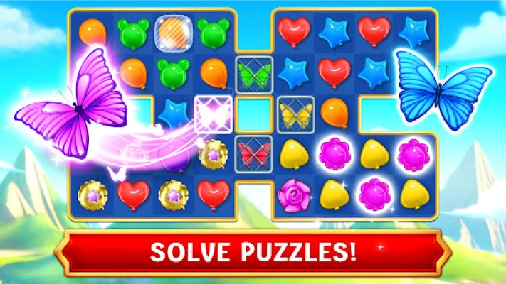 Belle's amazing adventure has taken her to a world she never knew existed. Far above the land, hidden by the clouds, is a city made entirely out of balloons. A great gust of wind has stirred up trouble in this beautiful world, mixing up all of the colors and causing parts of the city to disappear! Only Belle can put things in order, and she's got just the match 3 skills to do it!