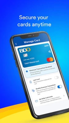 - Secure your cards real-time using lock or unlock card, disable overseas debit card transactions, and set your debit card limits