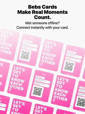 Innovative Bebs Cards: Meet people in a refreshingly new way! Our unique Bebs Cards, with their individual QR codes, are your ticket to authentic interactions. Hand one to someone you find interesting, and they can instantly connect with you in the app. It's real-world meets digital - making every encounter more exciting!