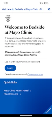 Bedside at Mayo Clinic transforms the inpatient experience by providing patients and their caregivers with real-time access to personalized interactive features to enhance their hospital stay, allowing patients to stay engaged in their care during a hospital stay at Mayo Clinic. To access Bedside at Mayo Clinic, you must have an existing Mayo Clinic account or create a new account. To sign up for an account, download the app and follow the prompts on the login screen. After you’ve signed up, turn on Face ID, Touch ID, or a four-digit passcode to quickly log in without needing to use your username and password each time. Then, make sure you have push notifications enabled to receive updates on your device when new information is available.