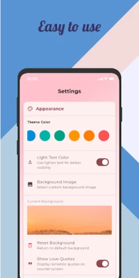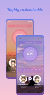 Beautiful Interface Customization: Personalize the day counter screen by changing the background photo to match your style. You can also easily edit couple information through the settings screen for a smooth, intuitive experience.