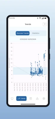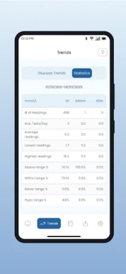The glucose report includes key summaries, trend graphs and statistics for the last 7, 14, 30 or 90 days (filter).