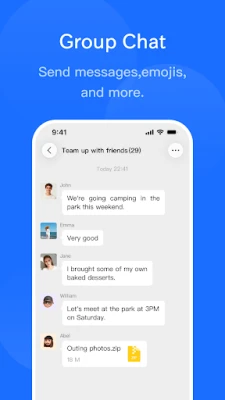 9. Support multiple types of chat messages, including text, emoticons, images, image-based voice annotations, voice messages, videos, files, encrypted files, self destruct messages, timed deletion messages, etc.