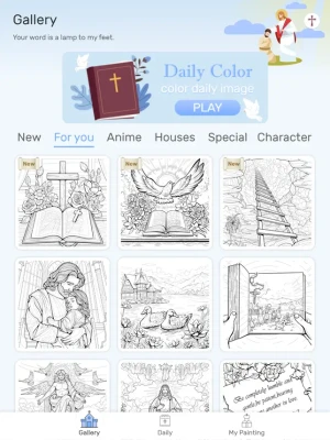 Unleash your creativity with Color-by-Number games. Choose vibrant or subtle colors, complete your Bible-inspired art, and save or share it. With every finished piece, you experience the joy of faith, art, and coloring. The app supports exporting your creations and tracking completed artworks in your Bible coloring book.
