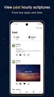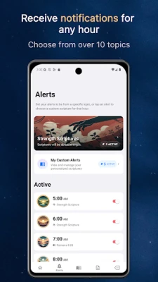 • HOURLY SCRIPTURES: Receive a fresh verse every hour. Choose from 10 topics such as Healing, Peace, Wisdom, or Strength.