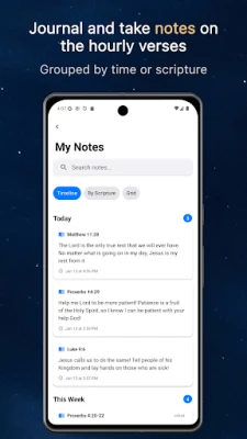 • JOURNAL & NOTES: Capture your inspirations on the hourly verses. Write unlimited notes and use our search/groupings to revisit your spiritual journal.