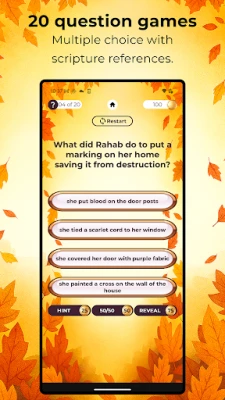 ● Quick 20 questions game ● 20 questions to grow in your biblical knowledge. You can stop and continue where you left off.