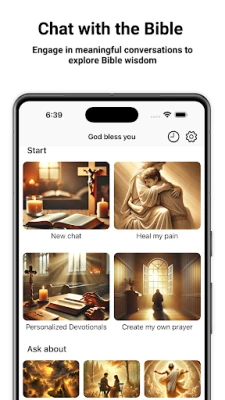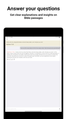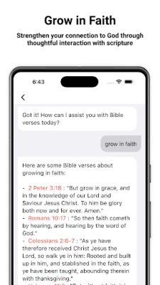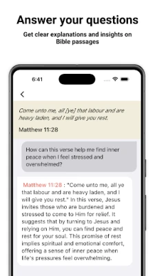• Real-time chat with scripture: Engage in meaningful conversations to explore Bible wisdom. • Answer your questions: Get clear explanations and insights on Bible passages. • Daily guidance: Receive personalized suggestions to support your spiritual journey. • Grow in faith: Strengthen your connection to God through thoughtful interaction with scripture.