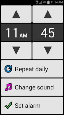✓ Easy to read - large font and high contrast color scheme ✓ Easy to control - large buttons for changing the alarm ✓ One time alarm, or recurring every day ✓ No other complicated features included. It’s so simple! ✓ And it’s 100% free!