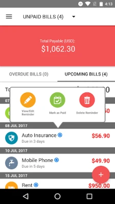 -Unlike other bill tracking apps, Bills Reminders will always fire off when the bill payment is coming due, no matter whether you have opened the app or not or whether you have rebooted your device.