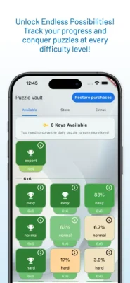 Binaris 1001 contains 3712 puzzles in various sizes (4x4, 6x6, 8x8, 10x10, 12x12 and 14x14) and different levels of game-play (easy, normal, hard and expert).