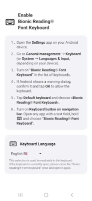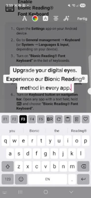 The Bionic Reading® Font Keyboard emphasizes words according to the principle of our patented Bionic Reading® method – live while you type, paste, and copy text. Your creativity has no limits. Everything runs on-device using Android’s system font with our Bionic Reading® method.