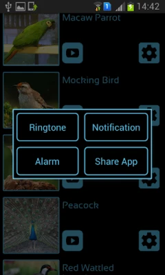 * Set these bird calls for your android phone as : Ringtone, Notification, Alarm with the help of our user friendly app. Only you have to touch our app setting button available with every birds and select options popped up as required and enjoy your life with amazing bird sounds & ringtones.