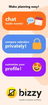 Bizzy is the go-to platform for making plans. Just add events and use it like a regular calendar. Add friends to allow them to compare schedules without sharing sensitive info like event titles and location!
