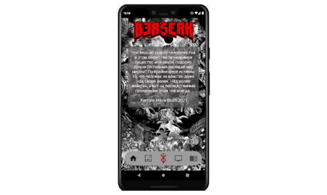 Возможности приложения: - Возможность установить обои высокого качества на ваше устройство, скачать, а также поделиться с вашими друзьями. - Репозиторий персонажей по вселенной берсерк. - Просмотр аниме онлайн. - Чтение манги онлайн.(планируется)