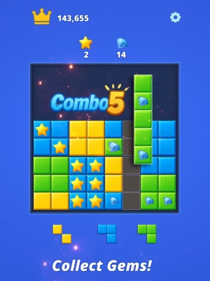 - Drag and drop jewel blocks into the grid to complete rows and columns.