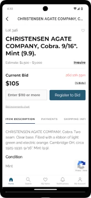 Participate in our sales while on- the-go and gain access to the following features: •Quick Registration •Following upcoming lots of interest •Push notifications to ensure you engage on items of interest •Track bidding history and activity •Watch live auctions