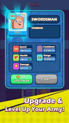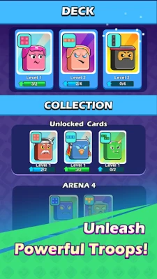 Collect and unlock new unit cards as you progress. Each unit has unique powers — from flying archers to hammer-wielding tanks! Create your dream deck to adapt to different battlefields.