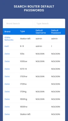 Offline access to default router usernames and passwords by brand/model. Supports most routers like TP-Link, D-Link, Netgear, Asus, and more.