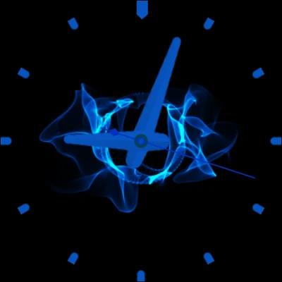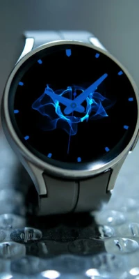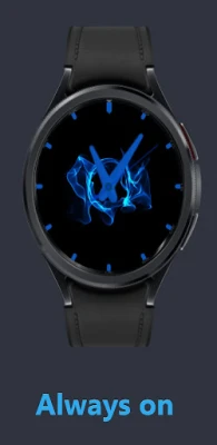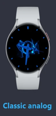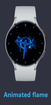 This app is for Wear OS. Moving flames background and classic look. Always on mode and all blue colors. Always on mode is very low power. Animated background with flames moving across the watch face. Sleek and modern look with classic analog hands.