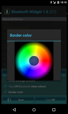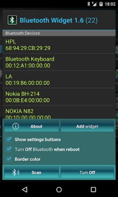 Implemented: • option turn off the Bluetooth adapter when device is reboot; • option switch types: one button or three (with buttons settings); • ability to change the border color of the widget (for Android 2.2 and above); • start scan for Bluetooth devices; • ability to change the horizontal and vertical size (for Android 3.1 and above); • option "Make discoverable" for other Bluetooth devices (button "More...").
