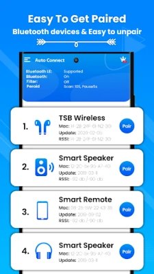 This Bluetooth pair and BLE Scanner app is quick and simple that allows you to manage all your Bluetooth problems easily and effortlessly. Get the Bluetooth devices available list with their useful information like Bluetooth device and signal strength. Connect to a secure device by using this BLE Scanner and bluetooth pair finder scanner app. This bluetooth connect scanner app is not only for developers or experts but also common users are using this bluetooth pair finder scanner for finding their Bluetooth-paired devices. Display a list of all paired devices and you can connect or unpair those devices with a single click. You can track your devices easily by using the Bluetooth pair auto finder app.