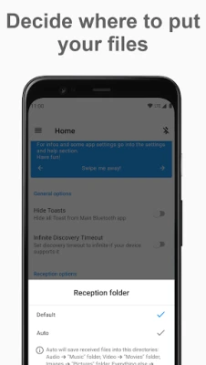 Some Features: • Receive any file type through bluetooth, with total control. Even files without any extension! • Decide in what way you will be notified when there is an incoming file • Open the list of files after reception • Set the discovery timeout to infinite • And more to come...