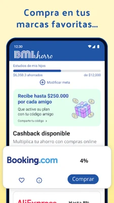 El cashback es otra ventaja que te permite sumar dinero a tu plan de ahorro por cada compra que hagas a través de BMI Ahorro en marcas como Avianca, Aliexpress, eBay, Booking.com, Camper o Expedia, entre otras. ¿Por qué es un beneficio? Porque sumas dinero a tu plan de ahorro de forma gratuita y sin esfuerzo.
