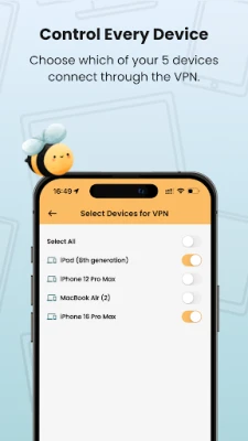 Select which of your devices should use the VPN. Protect your phone and laptop while leaving the smart TV or kids’ tablet on the local internet. One account. Your rules.