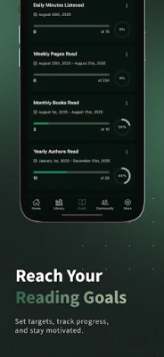 Reading Goals - Set and monitor goals by pages, minutes, books, or authors. Customize them by week, month, or year.