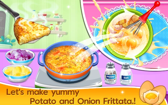 Let's have some cooking in home kitchen! In Breakfast Maker 2 you'll learn how to make Chocolate zucchini bread, Cinnamon Rolls, Pancake, Mini Muffins, Pita Pizza, Potato & Onion Frittata, Sour cream donuts! Which food do you want to try first? Come on! Let's get started right now! Start by collecting the required ingredients, follow cooking instructions and at the end decorate your breakfast with fresh fruits and vegetables! Share your creativity with your friends and family by sharing ready to eat breakfast food picture!