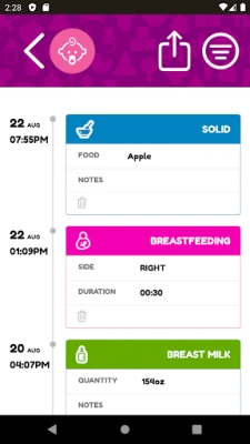 - Fully offline and private. All data is encrypted and stays on your device - Log breastfeeding, pumping, bottle feeds, formula, and solid foods - Use a timer or enter feeding sessions manually - View daily patterns with charts and timelines - Export PDF feeding logs for doctors or caregivers
