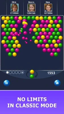 Finally choose Classic mode to relax and forget about the daily routine by tapping bubbles. No energy, no lives, no limits. Clear the play field making groups of three or more bubbles of the same color and try to make huge bubble avalanches. The indicator in the bottom left shows the number of unsuccessful shots till another line appears. Start with Easy Ride game difficulty, reach new bubble shooter levels of skill and become a master.