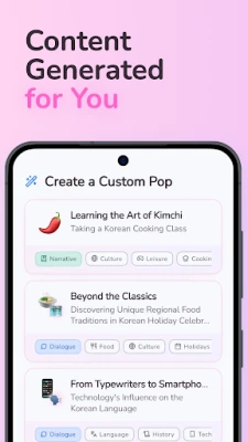 • Personalize every Pop: pick from thousands of ideas or create your own prompt, and our AI assembles level-appropriate reading with inline insights and natural audio in seconds.