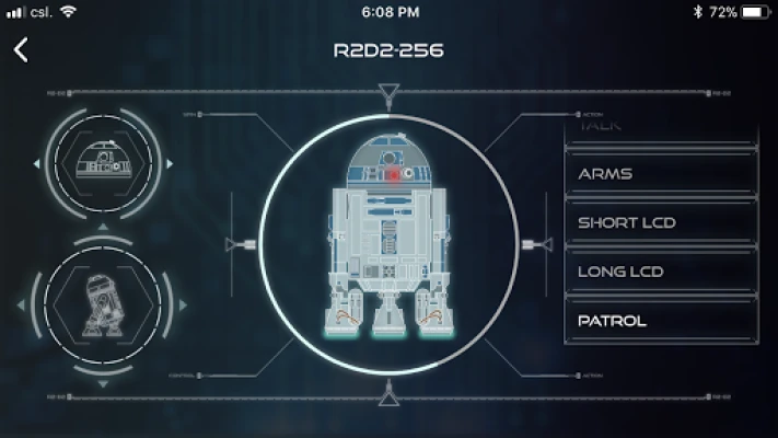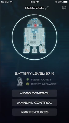 - When Video Control is on, your smartphone screen displays the view from R2-D2's camera, which will change as you drive him around or turn his head. A set of remote controls are superimposed at the bottom. You can capture still pictures or video from his point of view, storing the images in a Gallery within the app or copying them to the library on your phone. You also have a scrollable menu of automatic routines, which include being able to set him exploring his surroundings in an autonomous Patrol mode, turning on his lights and sounds, ejecting a lightsaber, and displaying video clips from his projector.