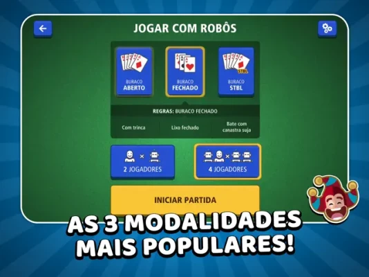 Escolha como você prefere jogar, entre Buraco STBL (Sem Trinca Bate Limpo, modo criado por nós, com muito orgulho!), Fechado ou Aberto. Forme mesas com 2 ou 4 pessoas e desafie outros jogadores, convide seus amigos e familiares para partidas, ou pratique contra robôs, no seu tempo.
