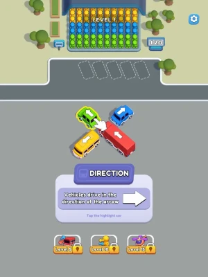- Tap a car or bus to move it, each one only travels in a single direction.